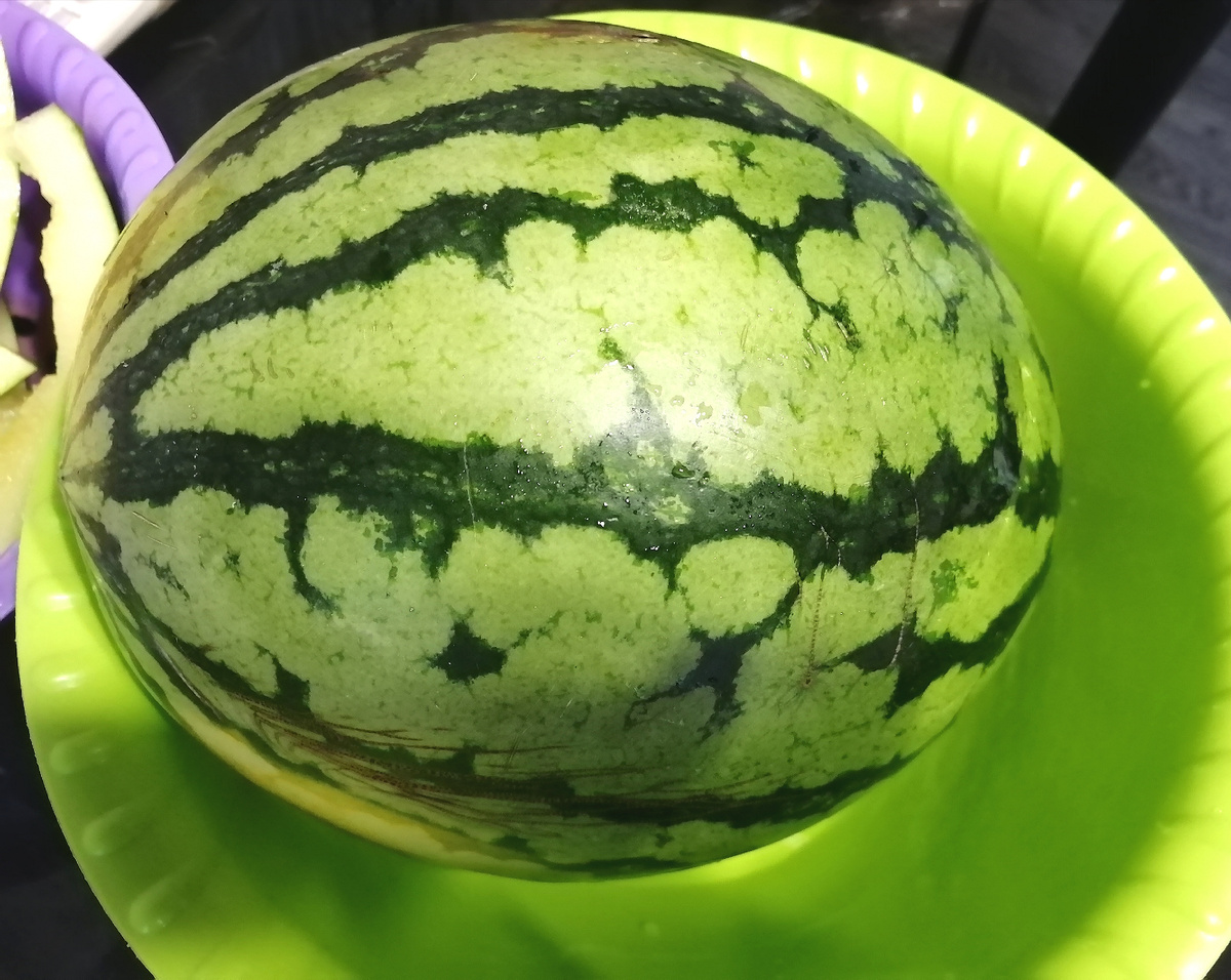 Приветствую всех заглянувших! Если раньше в продаже был только один традиционный сорт арбуза, то с каждым годом появляются всё новые и новые сорта, и даже квадратным арбузом ни кого не удивишь. Но если честно, то я до сегодняшнего момента кроме красного обычного ни какой и не пробовала. Потому что всегда боюсь, что это ерунда и деньги на ветер. Согласитесь сейчас и красный-то арбуз зачастую не красный, не сладкий и вообще пустой. Раньше в детстве такие были вкусные арбузы, и настолько были сахарными, а сейчас по ходу разучились выращивать, или что-то мудрят. Я бы до сих пор не купила какой-то особенный арбуз, если бы не дети. Им настолько всё интересно, цена им безразлична 😀, а когда кому-то сильно хочется, то и тебе интересно за компанию. Поэтому решили начать с дегустации жёлтого арбуза. Он даже по внешним признакам отличается от своих собратьев. Купили мы жёлтый арбуз в Магните, цена за кг - 49 руб. Арбуз был в сетке, производитель Соль-Илецк. По деньгам он нам обошёлся в 180 р