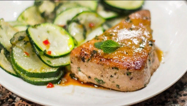 ИНГРЕДИЕНТЫ Тунец 800 г Растительное масло 150 мл Чеснок 3 зубчика Лимонный сок 1 столовая ложка Молотая паприка ½ чайной ложки Рубленая петрушка 10 г 1. Пюрировать петрушку и чеснок добавив сок лимона и паприку, при помощи блендера, вливая постепенно тонкой струйкой оливковое масло 2. Полить стейки 2/3 приготовленного соуса и, накрыв пищевой пленкой, убрать на полчаса для маринования в холод 3. Убрать с рыбы лишний маринад, подсолить и обжарить на сковороде с раскаленным маслом с одной стороны 4 минуты и затем еще 2 минуты с другой 4. При подаче полить стейки оставшимся соусом, подавать с гарниром из овощей. Понравился рецепт — поделитесь им с друзьями в социальных сетях! Готовьте вместе с «Едой»!