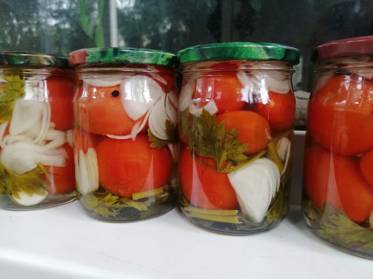 Вчера вечером "пришлось" самой делать помидорки по этому рецепту. Не было фотографии этих помидорок, а уж очень хочется с Вами этим рецептом поделиться, как можно скорее. Вообще я поняла сейчас, когда у меня появился свой канал, что моим большим упущением было то, что я мало фотографировала свой огород и свои заготовки. И это хочется разместить на канале, и то. А фотографий нет... Это был один из первых рецептов, по которому я попробовала замариновать помидорки. В самом-самом начале своих заготовочных историй. И вот сколько он уже со мной. Никогда не откажусь от этого рецепта. Помидорки получаются очень вкусными. Вкусным получается и лук по этому рецепту. И рассол. Ууууу. Вообще, если я открываю такую баночку, съедается и выпивается все. А не это ли счастье для хозяйки, которая приготовила блюдо с такой любовью? Приготовление: Помидоры в этот рецепт идут целиком. Лук нарезать кольцами или полукольцами. Зелень мелко порубить. Крупные зубочки чеснока разрезать. На дно баночки положить р