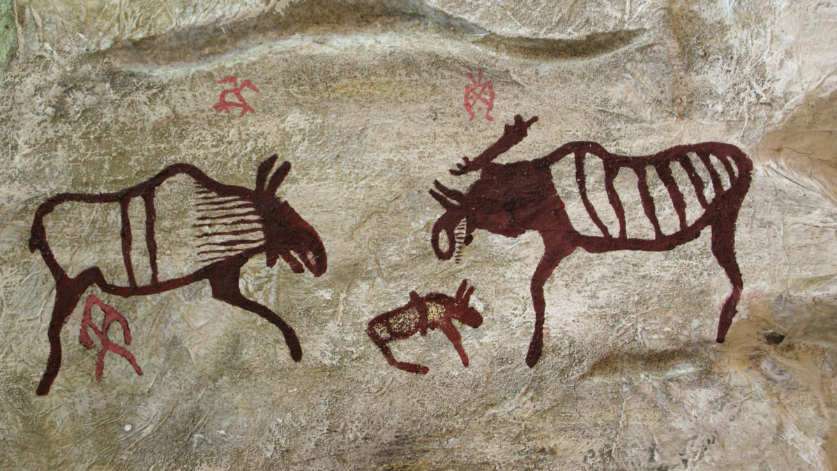 Чаще всего наскальная живопись в России обнаруживается на берегу водоемов. У озера Байкал, у Онежского озера, на Белом море. Как правило, и ниже мы поймем почему, в качестве места для нанесения рисунка избиралось какое-то укромное местечко – гроты или небольшие пещеры. В качестве краски художники первобытных времен использовали чаще всего охру, в которую добавлялись животные жир и кровь, что делало рисунок более долговечным. Наиболее часто встречаются росписи красного цвета (в чем вы убедитесь посмотрев на соответствующие рисунки). Другие цвета встречаются намного реже. Охра хорошо впитывалась в скальную породу и именно поэтому рисунки смогли сохраниться до наших дней. Тематика росписей на скалах в России в целом такая же как и в Европе – сцены охоты или ритуальных действий. В качестве объектов, наносимых на скалы выступали не только люди но также и звери, рыбы, всевозможные (в том числе и геометрические) символы. В целом на стены пещер и открытые участки скал и камни переносилось само мировосприятие первобытного человека, где весь космос оказывался взаимосвязан, одухотворен, а человек по представлениям древних находился в мистической, либо же родственной связи с животными.