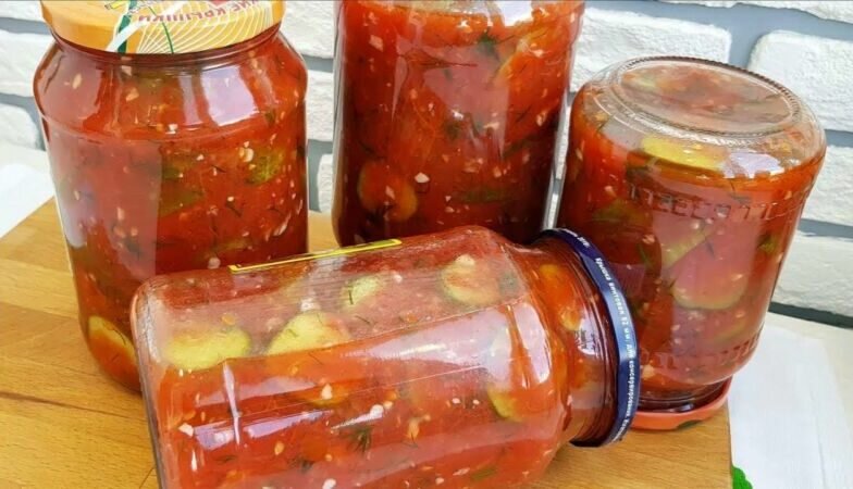 Огурцы и помидоры -самые популярные овощи для маринования. Хочу порекомендовать рецепт проверенный годами салата на зиму. Нам понадобится: 2,5 кг-огурцов, 1,3 кг-помидоров, 60г-чеснока, 1/2ст-растительного масла,1/2,ст-сахара,1ст.л-соли,1ст,л-уксусной эссенции. Огурцы замочить в холодной воде на 1 час. Затем вымыть, нарезать дольками. Помидоры вымыть, срезать плодоножку и пропустить через мясорубку.Переложить помидоры в большую емкость и довести до кипения. Влить растительное масло, добавить сахар и соль. К содержимому добавить нарезанные огурцы, кипятить примерно 15 минут. В конце кипячения добавить чеснок,выдавленный через пресс и влить уксусную эссенцию. Разложить в стерилизованные банки и закатать. получается 5 банок по 0,5 л. Банки обязательно перевернуть вверх дном ,укутать,дать полностью остыть. Получается очень вкусный салат ,родные и знакомые будут в восторге.