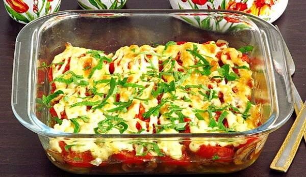 Кабачки с грибами и помидорами в духовке Приготовление: 🔹 Кабачки молодые — 1 шт. 🔹 Лук репчатый — 2 шт. 🔹 Помидоры — 2 шт. 🔹 Шампиньоны — 300 г 🔹 Масло растительное — 1 ст. л. 🔹 Майонез — 2 ст. л. 🔹 Петрушка свежая — 0,5 пучков 🔹 Приправа овощная — 2 ч.л. 🔹 Соль — 0,5 ч.л. Приготовление: 1 Для этого блюда лучше взять молодые кабачки с мягкими семенами. 2 На мой взгляд, с ними запеканка получается нежнее и вкуснее. 3 Для того чтобы в форме было как можно меньше жидкости, помидоры лучше брать мясистые, с небольшим количеством сока и семян. 4 Если взять обычные сочные помидоры, то семена вместе с соком нужно удалить и использовать только мякоть. Любая хозяйка может вносить в блюдо свою изюминку. 5 Например, вместо шампиньонов можно использовать благородные лесные грибы. Если кому-то не хочется использовать покупную овощную приправу с солью, то можно заменить её только солью. Это уже дело вкуса! Ставьте лайк и готовьте с удовольствием! ❤️ Приятного аппетита ❤️
