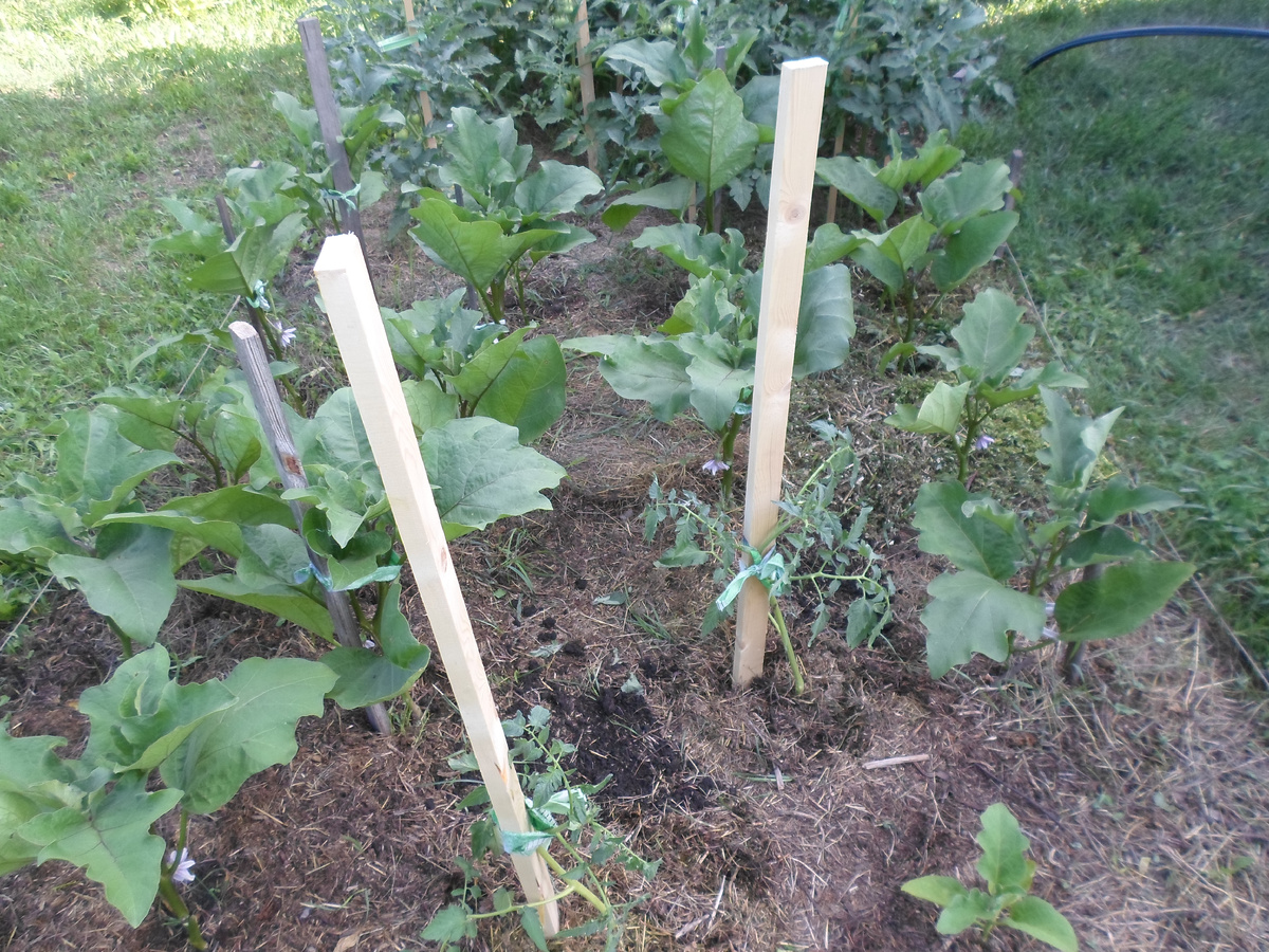 Здравствуйте. Вчера сходила на дачу. После дождя поливать огород не надо, зато появилось больше времени на другие дела. Некоторое время назад, когда делала капитальную обрывку пасынков на помидорах, выдернула два длинных пасынка, выросших из почки, расположенной прямо на уровне почвы. На них даже небольшие корешки появились. Стало мне их жалко. Рука не поднялась выкинуть, поэтому налила в ёмкость воду, поставила их в неё и расположила под яблоней - выживут, значит, выживут. Несколько дней листья у пасынков висели ушами спаниеля, но потом очухались. Кажется, прошло недели две с того момента. Теперь же растения обзавелись длинными корешками. У меня на грядке освободилось место - у двух баклажана кто-то съел корни, и они погибли. Ту да и решила посадить выжившие помидорки. Отодвинула мульчу, слой которой сильно истончился (я её ещё не добавляла повторно) и сделала лунки. Этот экспериментальный участок грядки с баклажанами я не вскапывала и даже не рыхлила плоскорезом, а просто подрезала т