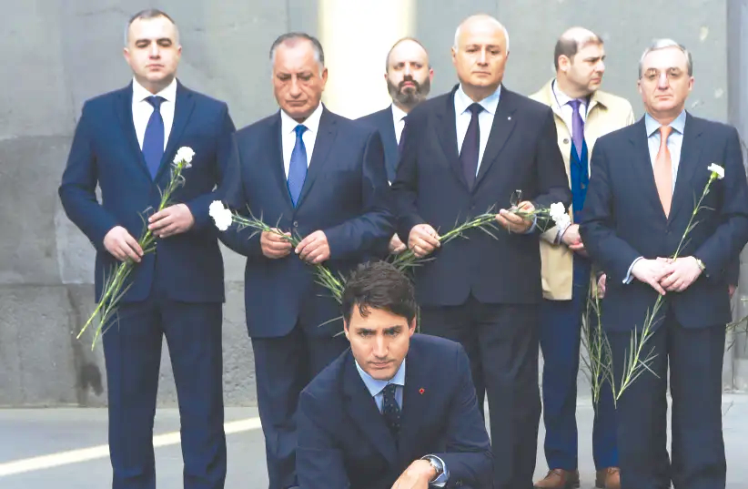 На этом снимке (фото Мелика Багдасаряна/REUTERS) на фоне некоторых тогдашних представителей отечественного госаппарата и гражданского сектора изображен премьер-министр Канады Джастин Трюдо в ходе своего визита в Армению в 2018 году. Тогда он совершил, можно сказать, примечательный поступок (даже с учетом возможной конъюнктурности мотивов): принял участие в церемонии возложения цветов к мемориалу Геноцида армян в Цицернакаберде в Ереване. За что потом удостоился критики со стороны лидеров некоторых государств.