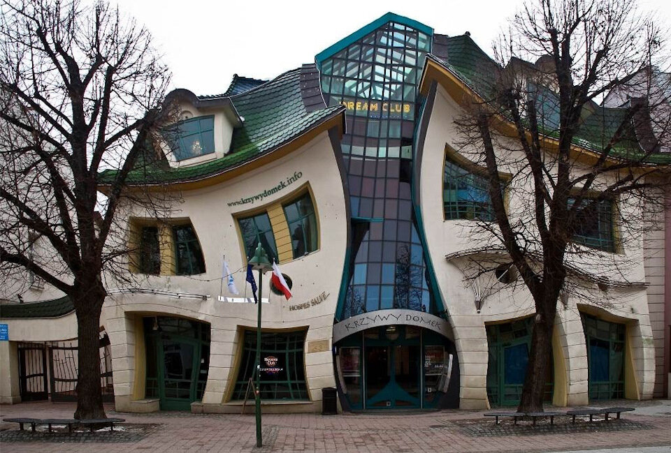Несмотря на причудливый внешний вид, «кривой дом» невероятно функционален внутри и по праву считается одной из главных достопримечательностей города. Возле этого поистине необыкновенного дома постоянно кипит жизнь и движение. На первом этаже причудливого дома располагаются уютное кафе и магазинчики. А на втором этаже находятся студии популярных радиоэфиров. Будете в Польше — обязательно сфотографируйтесь на фоне этого футуристического строения.
