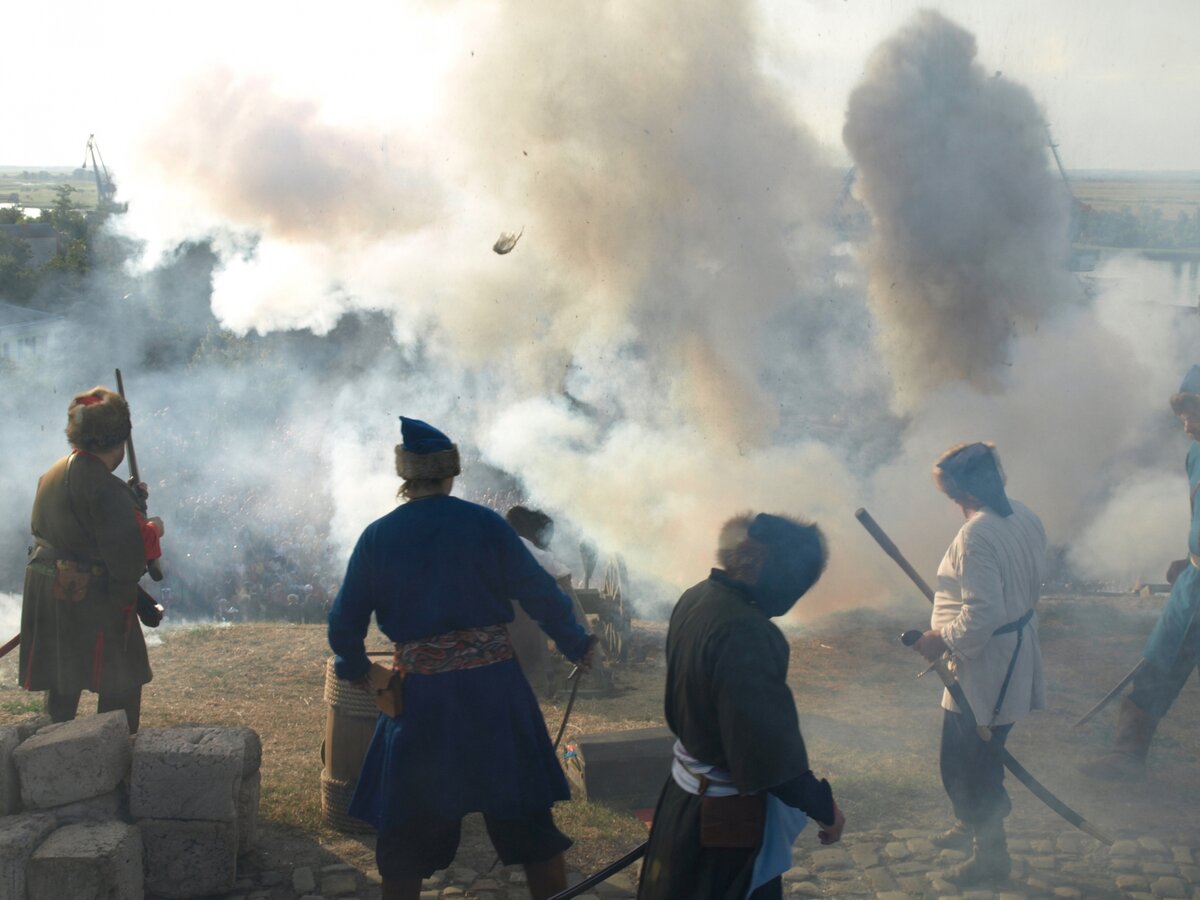 - Шо, куськины дети, понюхали пороху казацкого! - Гмыза руководил пищальниками, стоя подбоченясь на кругляках настила, - А ну ж, ребята, заряжай! Стрельнул и заднему быстрее передавай. Уйдут окаянные!
