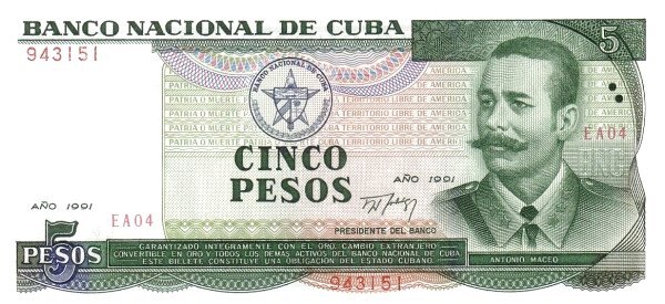 В 1991 году, спустя 30 лет после выпуска первых банкнот социалистической Кубы, Национальным банком было принято решение об изменении их дизайна, в первую очередь, для улучшения их защиты от подделок. Изменения коснулись знаков от 5 до 50 песо. Средства защиты были усилены, также появился кодовый рисунок (номинал купюры, напечатанный шрифтом Брайля). Дизайн изменился радикально: портрет сместили в правую часть билета, в левой стороне появилось купонное поле для водяного знака. Портреты сохранили прежними, но на обороте поместили рисунки, посвящённые истории революционного движения на Кубе и достижениям кубинского социализма. На билете в 5 песо изображён Антонио Масео; напротив него – испанский генерал Мартинес Кампос, оба сидят в походных гамаках. Поодаль видны фигуры испанских офицеров и повстанцев. Это отнюдь не мирная беседа – генерал Кампос требует от солдат Масео сложить оружие. Дело в том, что за десять лет вооружённой борьбы (с 1868 года), силы восставших кубинцев были подорваны