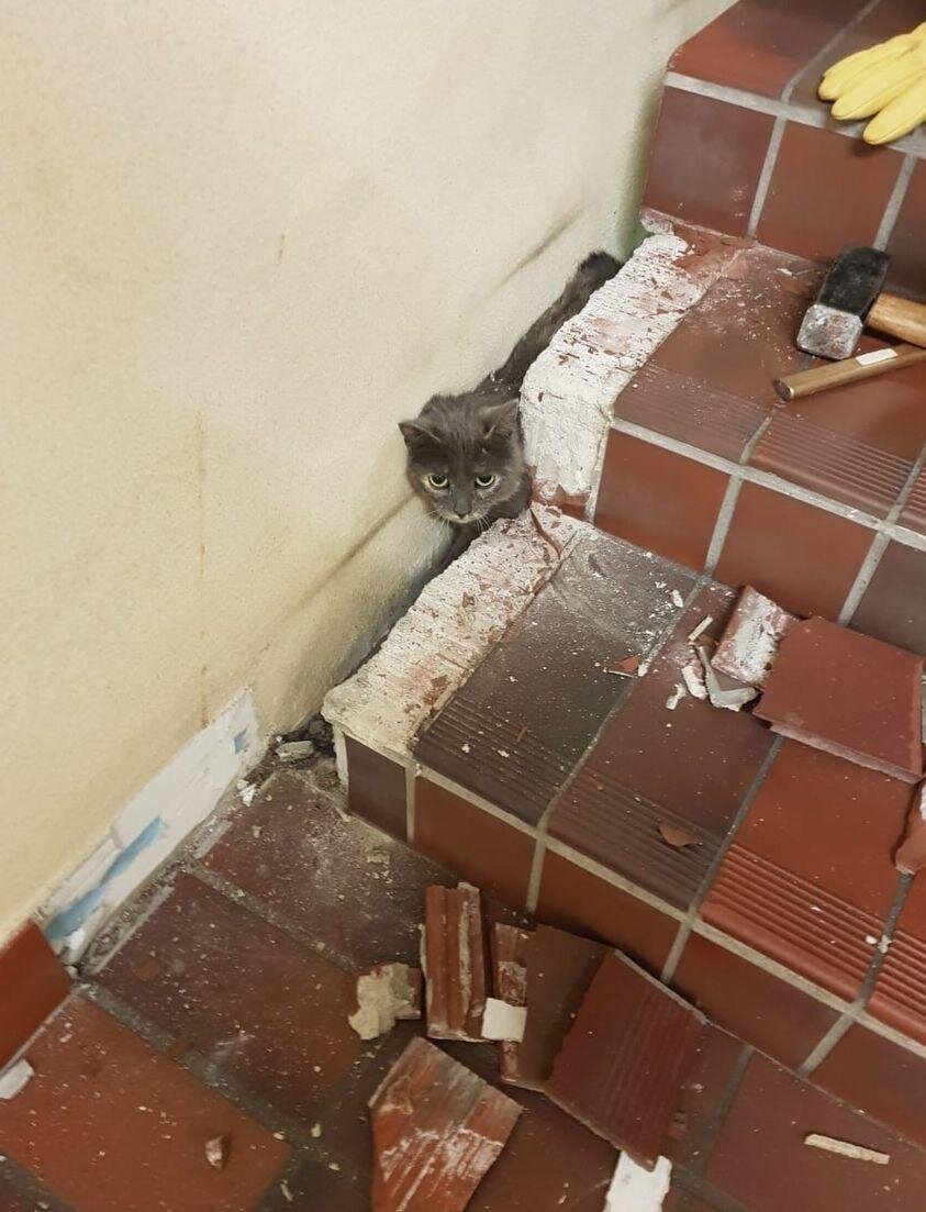 Эта история случилась в понедельник около 9 часов утра. Место действия – Фрёнсберг, земля Северный Рейн-Вестфалия (Германия). Улицы опустели: большинство людей успели разойтись по своим рабочим местам. Женщина, имя которой почему-то не сообщается, подошла к своему дому, зашла в подъезд и уже собралась было подниматься, как услышала жалобные звуки. Женщина проявила любопытство и начала поиски источника звука. Всё верно – это не галлюцинация, а самые что ни на есть крики о помощи, исходящие от маленького беспомощного котенка. Неким непостижимым образом малыш умудрился втиснуться в узкое пространство между лестницей и стеной и застрять. И не просто «застрять», а застрять намертво. Конечно, добрая женщина попыталась обойтись «малыми средствами», помочь котику без посторонней помощи. Но после многочисленных бесплодных попыток стало ясно: без помощи профессионалов не обойтись. Вызов приняли местные пожарные и выразили готовность помочь. Одно слово – браво, дорогие огнеборцы! Служивые тоже ре