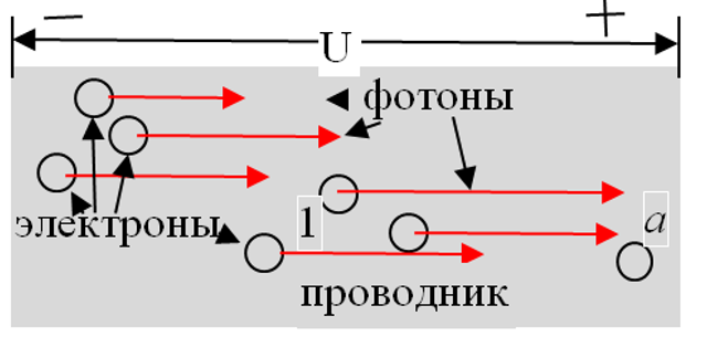 При подаче на проводник напряжения электроны придут в движение и излучат фотоны, которые и полетят в этом же порядке в пространство. Если, например, электрон а задержит фотон один, то фотон 1 задержится, но сечение фотона, то есть вектор Пойтинга, останется прежним. Вот такая и будет толщина фотона. Конечно, это идеальная картинка излучения фотона. На самом деле фотоны будут излучаться во все стороны от проводника. В этом повинна и форма проводника, и тепловое движение, и отражения, и преломления и тому подобное. Диаграмма излучения будет шарообразной. Это мы видим на практике.