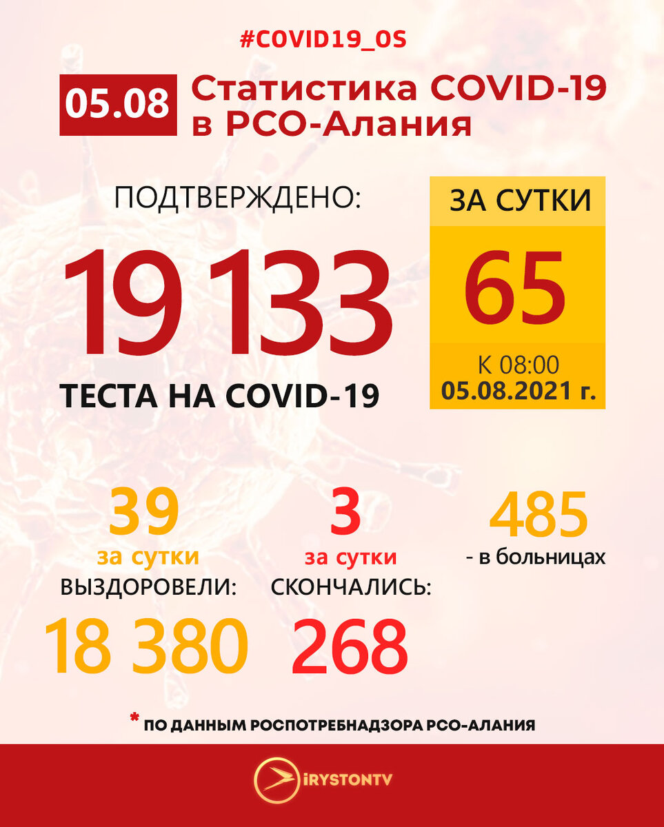 По данным Роспотребнадзора РСО-Алания на 08:00 5 августа 2021 года в Республике Северная Осетия-Алания зарегистрировано 19 133 (+65 за сутки) случаев заражения новой коронавирусной инфекцией.