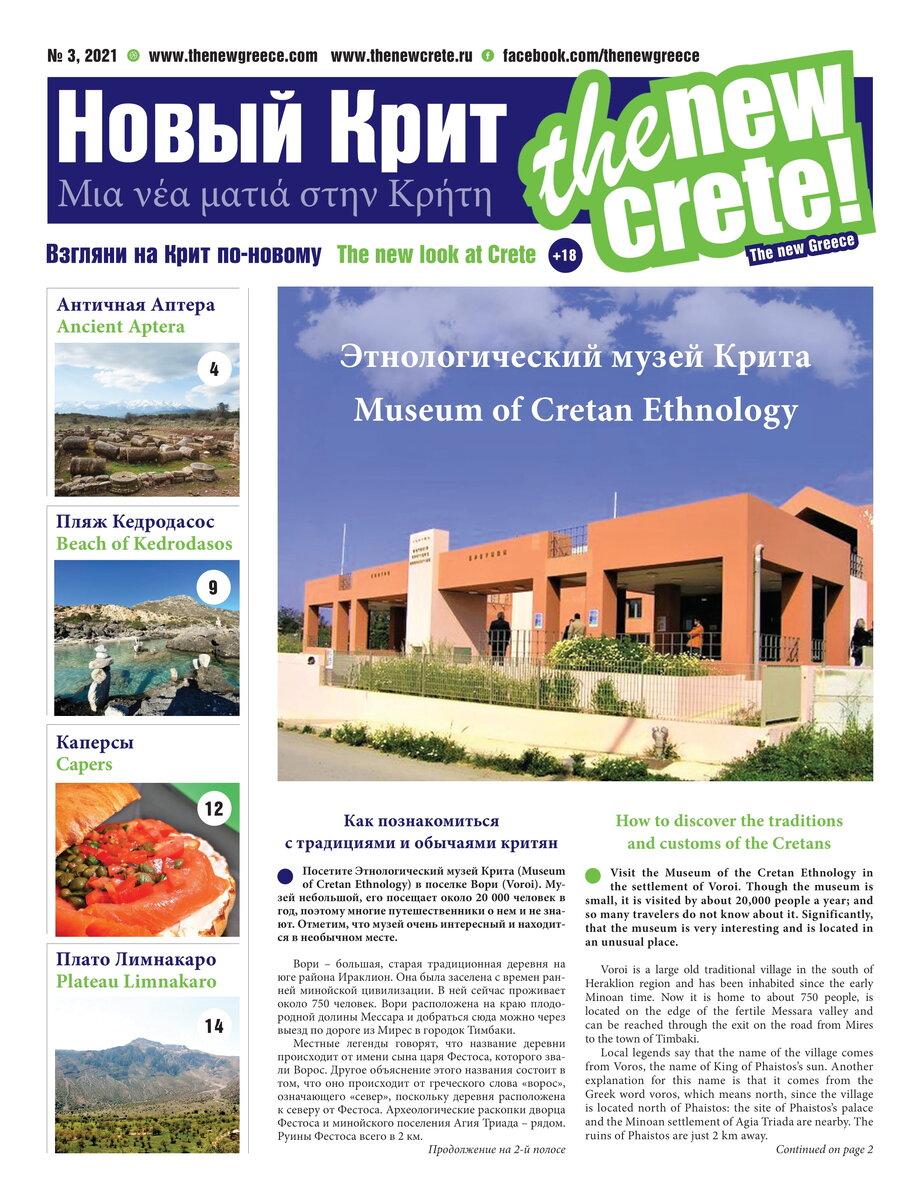 Выходит из печати очередной номер газеты «Новый Крит». Что можно прочитать в этом номере? Как познакомиться с традициями и обычаями критян. Посетите Этнологический музей Крита в поселке Вори (Voroi). Музей небольшой поэтому многие путешественники о нем и не знают. Отметим, что музей очень интересный и находится в необычном месте. Вори – большая, старая традиционная деревня на юге регоина Ираклион. Она была заселена с времен ранней минойской цивилизации. В регионе Ханья рекомендуем посмотреть на остатки двух древних городов – Полирринии и Аптеры. В греческой мифологии Аптера была местом легендарного состязания в музыке и пении между сиренами и музами. А Полирриния – величественный город-государство Древнего мира на северо-западе Крита, территория которого занимала всю западную оконечность острова. Отдавая дань воинскому искусству жителей города, историки называли Полирринию «Спартой Крита». Небольшое плато Лимнакаро (рядом с плато Лассити) в основном известно среди любителей природы, по