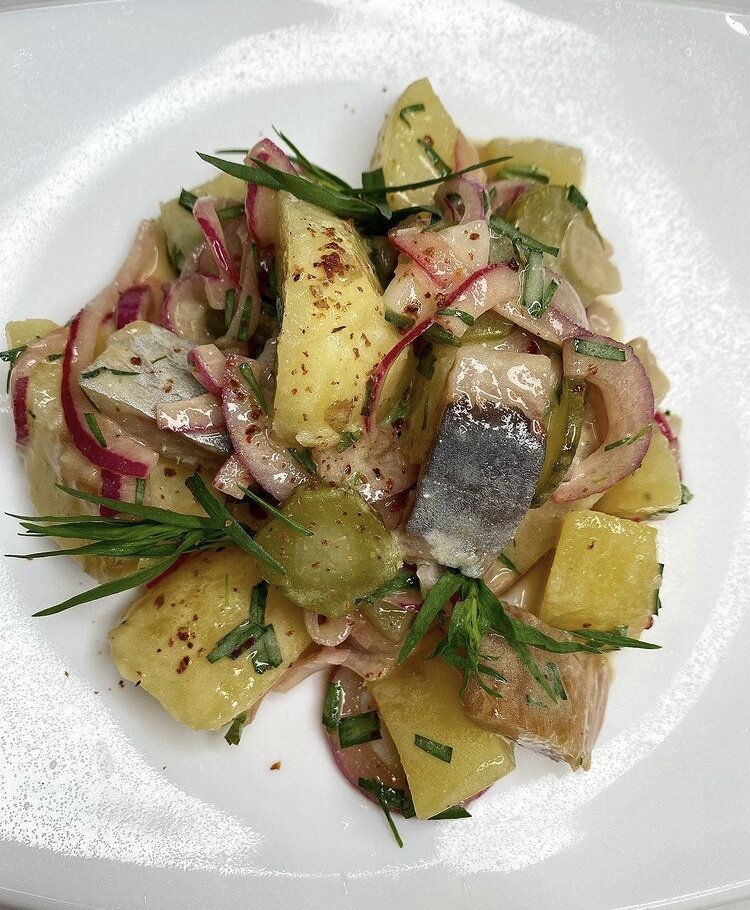 САЛАТ С СЕЛЬДЬЮ , МОЛОДЫМ КАРТОФЕЛЕМ И МАРИНОВАННЫМ ЛУКОМ. Если ты так же любишь селедку как я, то этот рецепт для тебя. Вкуснотища!!! У меня микс из сельди : копченая и сельдь слабой соли. Можно использовать только слабой соли ,но мой вариант идеален. Итак, не буду томить, приступим к рецепту…. ИНГРЕДИЕНТЫ: •Филе сельди слабой соли - 1 половинка •Филе копченой сельди - 1 половинка •Картофель - 4 шт •Огурцы маринованные - 3 шт •Красный лук - 1шт •Соль-½ ч.ложка •Сахар - ½ ч.ложка •Уксус 6%- 2 ч.ложки •Эстрагон (или укроп )-пучек •Нерафинированное подсолнечное масло -3 ст.ложки •Горчица-1 ч.ложка •Мёд-1/2ч.ложка •Сметана 20%-2ст.ложки •Сок лимона -1,5ч.ложки •Соль ПРИГОТОВЛЕНИЕ: Картофель помыть ,завернуть в фольгу и отправить запекаться на 190*-50 минут.Дать остыть в ней. Лук нарезать полукольцами. Добавить сахар , соль и уксус, положить в банку и хорошо встряхнуть. Оставить мариноваться на 10 минут . Добавить зелень. В нерафинированное подсолнечное масло добавить горчицу