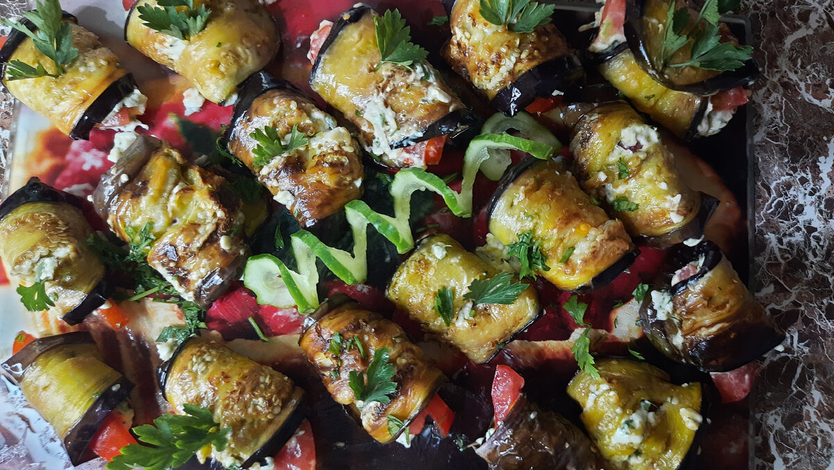 Такая вкуснота может украсить даже праздничный стол. Для приготовления понадобится стандартный набор ингредиентов: Баклажаны нарезаю тонкими полосками. Солю баклажаны по вкусу, ( у меня они не горькие), поэтому я их не вымачиваю, а сразу обжариваю на раскаленном растительном масле. Тем временем, нужно натереть плавленый сыр, соединить его с пару зубчиками выдавленного через пресс чеснока и мелко нашинкованным, небольшим пучоком зелени. Вместо плавленого сыра, можно использовать творог. В зависимости от размера помидоров, нарезаем их кольцами или полукольцами. Обжаренные баклажаны намазываю пастой из сыра чеснока и зелени, сверху выкладываю кусочек помидора. Сворачиваю закуску рулетом. Готовую закуску ставим в холодильник, а затем украшаем на своё усмотрение, подаем к столу. Количество ингредиентов я брала произвольно. На 4 некрупных синеньких мне понадобилось: 200г сливочного сыра, 2 зубчика чеснока, две столовые ложки майонеза, немного укропа и петрушки. Несколько некрупных помидоров