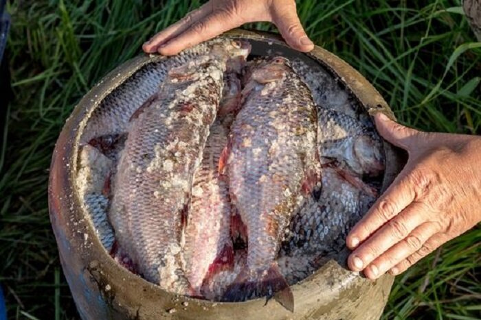 После того, как рыба давала сок (чаще всего на второй день) ставили груз и убирали бочку с рыбой в прохладный погреб.