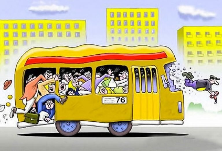 Общественный транспорт, особенно в час пик, это незабываемый аттракцион. Сначала дождаться нужный трамвай (автобус, троллейбус), потом туда влезть и как-то доехать до нужной остановки (не задохнуться в жару, чтобы не укачало, не превратиться в плоского человечка и т.д.). Хорошо, если выходишь на конечной, в противном случае, придётся вылезать ужом, попеременно спрашивая: "не выходите на следующей?", и извиняться, что отдавил чью-то конечность... В общем, как многое в нашей жизни - грустно и смешно. Всех больше карикатур посвящено извечной проблеме - как доехать утром на работу (и обратно), а также на дачу в выходные. Конечно, отдельного внимания заслуживают отношения между самими пассажирами и проблемами водителей О том, как иногда сложно разобраться, какой маршрут, куда едет, а если ещё стекла некачественные или инеем покрылись, то совсем можно не туда уехать. Взгляд в будущее на общественный транспорт в эпоху кризиса: Нашему городу повезло, что газели почти пропали с улиц, а то поез