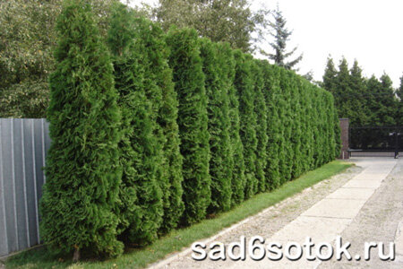 Обозначить границы садового участка и скрыться от любопытных глаз прохожих поможет живая изгородь из определенного вида хвойных растений, например саженцев ели обыкновенной, туи западной, можжевельников или их комбинаций (ель и можжевельник, золотолистная форма туи западной и голубоватая хвоя кипарисовика или можжевельника скального).