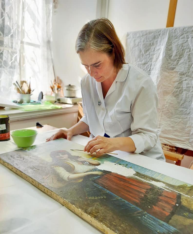 В Вологодском филиале Центра Грабаря продолжается реставрация произведения итальянского художника Эгисто Феррони (1835 – 1912) «Девушка с гитарой» из фондов Устюженского краеведческого музея. Памятник является панданом к работе «Юноша с мандолиной», реставрация которой была завершена в июне. ⠀ «Девушка с гитарой» поступила на реставрацию с многочисленными прорывами основы, что стало причиной усадки и деформации холста. Значительная утрата грунта с красочным слоем, расположенная в области вертикального прорыва, обнажила поверхность авторского холста, что со временем негативно отразилось на его состоянии. Наблюдалась неудовлетворительная связь грунта с основой, плотные поверхностные загрязнения с лицевой и тыльной сторон. Обширные утраты грунта повлекли за собой утраты фрагментов изображения. ⠀ С памятником работает художник-реставратор первой категории Юлия Евгеньевна Шелкова. Реставратором выполнено устранение усадки авторского холста, затем состыкованы и заделаны прорывы основы с вос