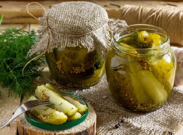 Маринованные огурцы с горчицей – один из моих любимых рецептов. Они сладковатые, хрустящие и одновременно в меру пикантные. Аромата и вкуса им добавляют пряности, нарезанный пластинками чеснок с зернами горчицы. Укроп можно класть как веточками, так и зонтиками. Можно даже купить в аптеке семена укропа. Для этого рецепта лучше использовать мелкие огурчики (не корнишоны, но самые маленькие из средних огурцов), поэтому закрывать их лучше в пол-литровые банки. А еще этот рецепт предусматривает стерилизацию и укутывание банок после того, как закручиваются крышки. Ингредиенты: На 1 пол-литровую банку: Маринад (на 8 пол-литровых банок): Приготовление: Начнем с приготовления маринада: кладем в воду соль и сахар, помешивая доводим до кипения, чтобы все растворилось. Вливаем уксус и выключаем огонь. Оставляем смесь остывать, поскольку заливать огурцы нужно охлажденным маринадом. Для маринования берем небольшие огурчики, желательно свежесобранные. Моем их, а затем замачиваем на час в холодной во