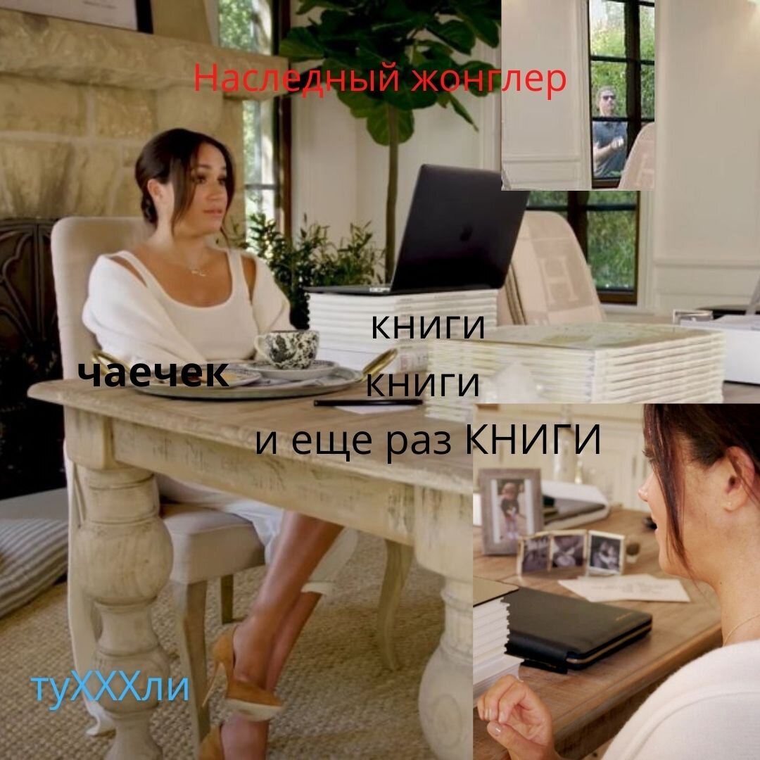 Только поглядите на фото – новый лайфхак – стопка книг под ноутбуком, как бы, дает отсыл к новому пространству для реализации герцогини и её супруга – книгописанию))) Я не могу вспомнить ни одного писателя или писательницу за последние 10-15 лет, кто так «ненавязчиво» рекламировал бы свои «шедевры»)))