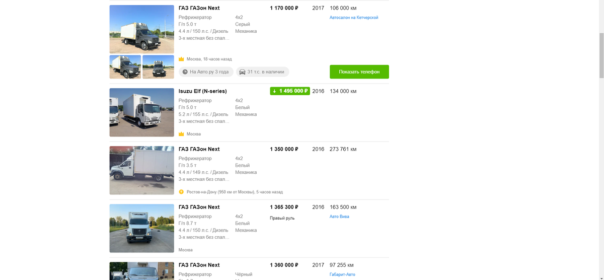 Когда я изучал грузовой рынок и биржу заказов, я понял, что для начала оптимальным выбором будет покупка пятитонника с рефрижератором. Заказов достаточно много, перевозки с температурным режимом оплачиваются в среднем на 20-30% больше. Брать машину меньшей грузоподьемностью я смысла не увидел, так как на рынке БУ грузовых автомобилей разница между пятитонниками и более маленькими грузовиками несущественна. К примеру, можно подыскать 3-5 летний пятитонник рефрижератор за 1 100 000 руб. – 1 400 000 руб., в то время как газели и портеры продаются по 800 000 руб. – 1 000 000 руб. Какие марки стоит изучить? Вариантов коммерческих автомобилей не сказать, что много, но выбрать все же есть из чего. Итак, стоит обратить внимание на Hyundai HD78, Isuzu ELF, ГАЗ ГАЗон NEXT. Сразу отмечу, что найти коммерческий авто на рынке БУ автомобилей крайне тяжело, так как 95% машин – это либо хлам с пробегом под пол миллиона, либо восстановленные, перекрашенные грузовики со скрученным пробегом, заменен