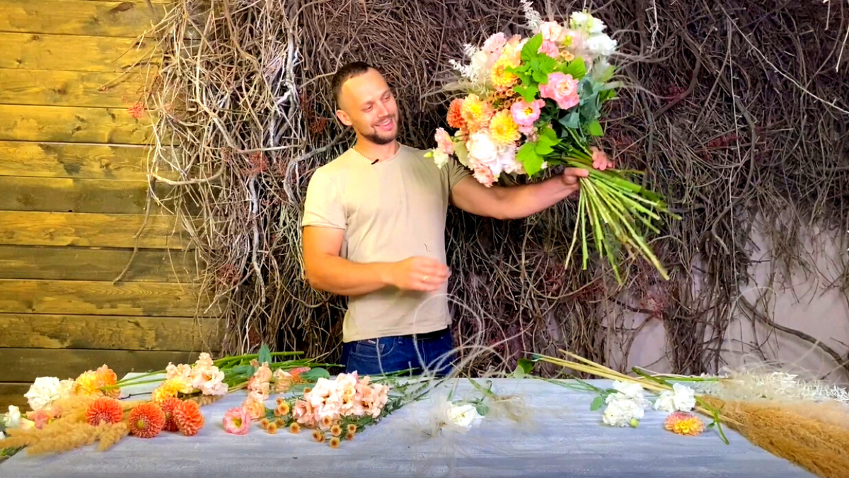 В видео рассказали и показали поэтапно, как собрать букет с переходом: с чего начинаем собирать букет с переходом, какие цветы выбираем в качестве фокусной точки, про работу с мелкими элементами, как сделать переход в букете, как добавлять сухоцветы, про перевязку цветов, почему выбрали такую цветовую гамму.