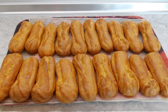 Духовку ставим разогревать на 180 градусов и тем временем отсаживаем эклеры. Располагаем тесто не сильно близко, так как они увеличатся в объеме. Важный момент - из мешка выгнать воздух, иначе эклеры просто потрескаются. Выпекать очень удобно и надежно на силиконовом коврике. Можно ещё сверху присыпать сахарной пудрой - так вероятность меньш