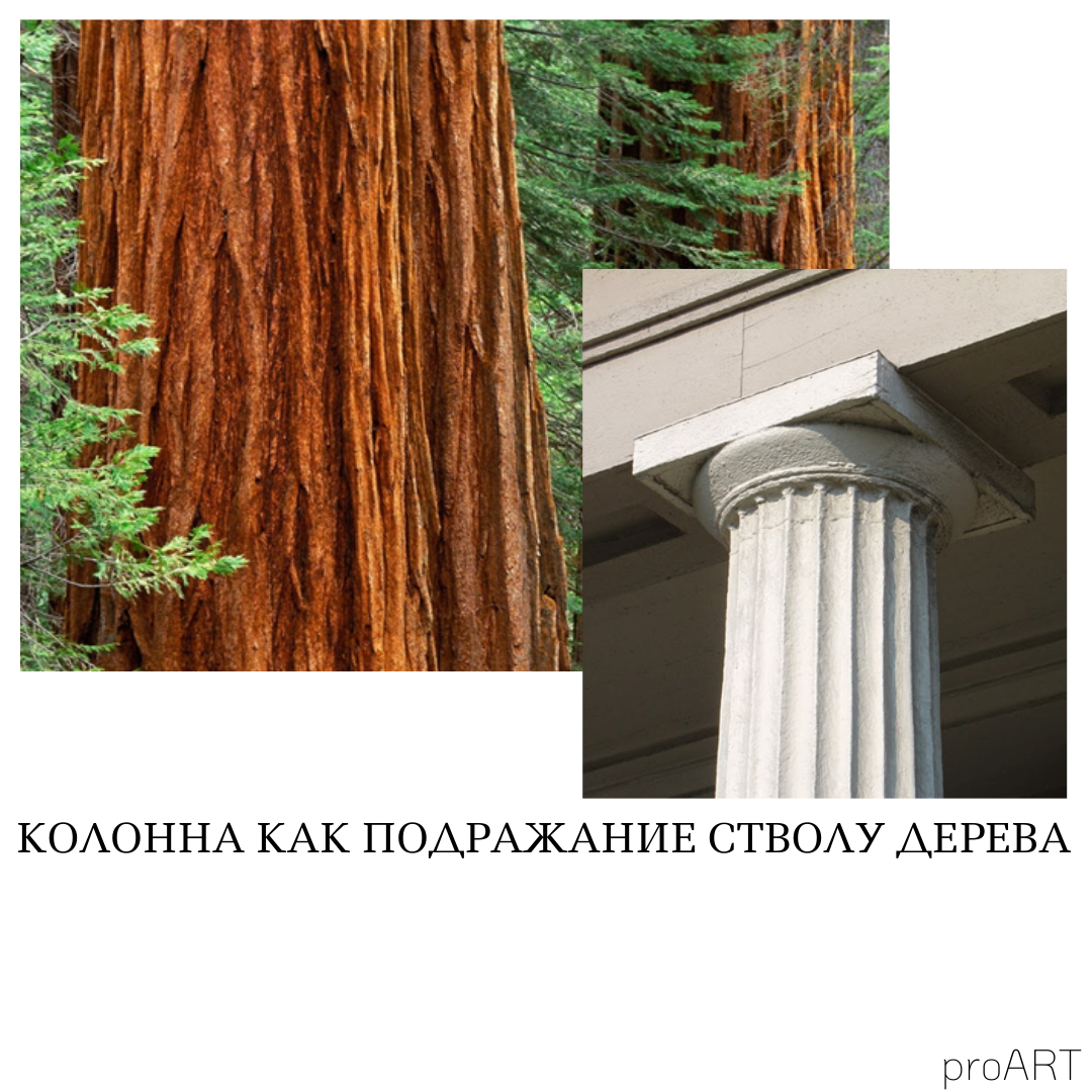 В форме колонн античности прочитываются пропорции стволов деревьев. «Каннелирование стволов перенято у растений с каннелированными стеблями», придающим им дополнительную прочность. Но особенности формообразования в архитектуре придают природным формам геометрический характер. Дорическую колонну принято интерпретировать как образ мужчины-героя, а сам ордер – как выражение его духовной и физической силы.
