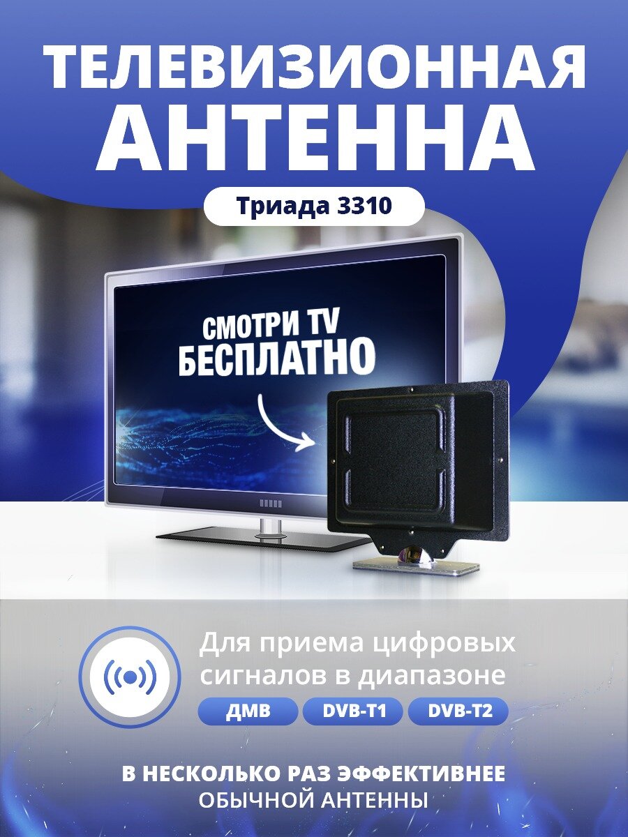 Нет возможности направить антенну точно на телебашню? Купите мощную антенну Триада-3310, которая разработана именно для этого случая! Для чего: Для ТВ тюнера с функцией цифрового ТВ стандарта DVB-T2. Для телевизора необходимо также приобрести инжектор питания (в комплект не входит). Встроенный усилитель. Антенна применяется в ситуации, когда направление на передающий центр неизвестно или нет возможности направить на него антенну. Работает на прямом и отраженном ТВ сигнале в условиях города и ближнего пригорода до 20 км. Эта Антенна-усилитель немного больше обычной антенны и в несколько раз эффективнее, предназначена для приема цифровых телевизионных сигналов DVB-T и DVB-T2, а также аналогового ТВ в диапазоне ДМВ 470-850 МГц. Антенна направляется на источник сигнала и обеспечивает надежный прием телесигнала в зоне уверенного прие