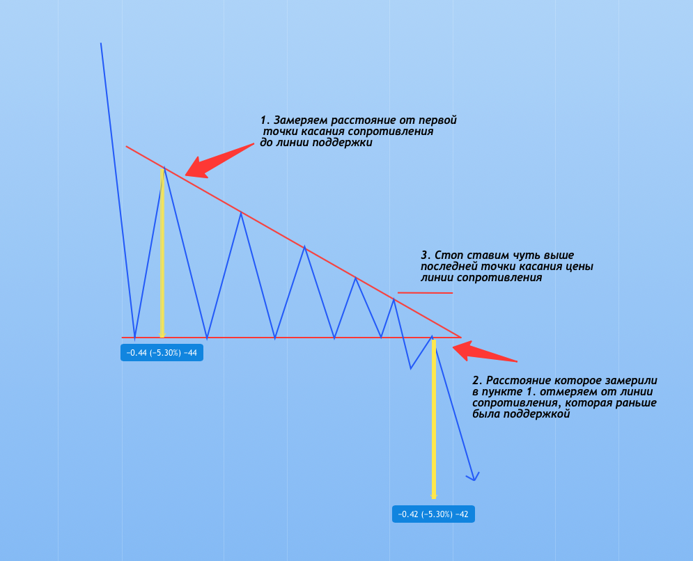 ЛЮБОЙ ТРЕУГОЛЬНИК СТРОИТСЯ ПО 4 ТОЧКАМ ВНЕ ЗАВИСИМОСТИ ОТ ЕГО ТИПА. ТРЕУГОЛЬНИКИ МОЖНО СТРОИТЬ НА ЛЮБЫХ ТАЙМФРЕЙМАХ Нисходящий треугольник образуется на нисходящем тренде. Как образуется нисходящий треугольник: В нисходящем треугольнике нижняя грань имеет горизонтальный вид. На нисходящем тренде цена акции доходит до определенного уровня и отскакивает вверх, далее цена разворачивается и снова идет вниз, дойдя до предыдущего значения снова отскакивает и идет вверх и разворачивается ниже прошлой точки. Таким образом у нас появляется 4 точки по которым мы можем нарисовать нисходящий треугольник. Как торговать восходящий треугольник. Чем больше касаний внутри треугольника тем сильнее будет импульс. Есть два пути входа в сделку: 1. Чтобы собрать максимальную прибыль, то входят после того как цена пробила поддержку (в случае нисходящего треугольника это его нижняя горизонтальная грань) В этом случае, если цена пойдет ниже, то можно забрать максимальную прибыль. НО! Когда цена пойдет ниже бе