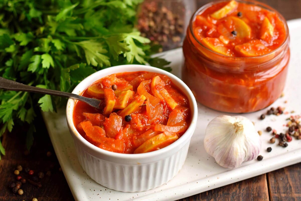 Лечо — отменная овощная закуска к любому гарниру, которую можно заготовить на зиму или приготовить небольшую порцию для обеденной трапезы. Предлагаем простой рецепт лечо, где основным овощем выступает кабачок. Тушатся кабачки вместе с луком в томатно-перечном соусе. Для достижения идеального вкуса используется небольшой набор пряностей. Даже если вы не планируете хранить лечо долго, все равно добавьте немного укуса, он сделает вкус более резким и выразительным. Ингредиенты: Приготовление: Перед приготовлением все овощи тщательно вымойте. Помидоры нарежьте произвольными кусками. Болгарский перец очистите от семян внутри, мякоть нарежьте. Подготовленные овощи поместите в чашу блендера. Перец и помидоры измельчите блендером в однородный состав. Также это можно сделать с помощью мясорубки. Полученную смесь перелейте в емкость для варки, установите на огонь. После кипения огонь снизьте до минимального, влейте растительное масло, всыпьте соль, сахар, добавьте томатную пасту, перемешайте, рав