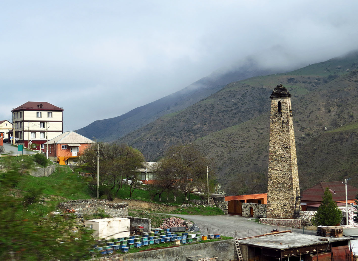 Джейрах - небольшой райцентр, единственный из всех шахаровых столиц не только сохранивший этот статус (районы по-ингушски и называют шахары), но и распространивший его на все 9 бывших шахаров Лоамороя (Горной Ингушетии). У центра села - одинокая старая башня: Сюда нас довезла всё та же "Нива", причём на маршрутках гости Армхи явно не очень-то ездят - один администратор назвал нам цену 400 рублей, а другой на следующее утро отправил нас бесплатно. Вот впереди - маршрутка на Назрань, четырежды в день отправляющаяся от длинного приземистого Дома культуры: Здесь же - воинский памятник с плитами солдатам Великой Отечественной, милиционерам (5 имён) и военным (1 имя) антитеррора. В наползшем тумане над Джейрахом красиво висел корабль то ли элитного отеля, то ли роскошной виллы Духургушта: Маршрутка тронулась, и попетляв в паутине джейрахских кварталов, подобрав там ещё нескольких пассажиров, миновала Аланские ворота на границе двух республик, спорящих за наследие древней Алании. Пер