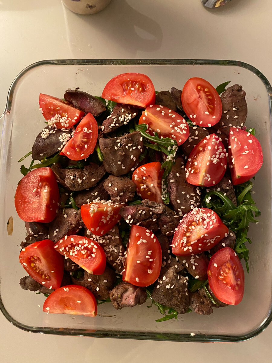 Самый вкусный теплый салат на мой взгляд! Все как обычно просто, быстро, полезно. Основа обожаемая мной руккола. Печень куренка режется кусочками, и обжаривается до готовности. Главное не пережарить. Лук, в идеале ялтинский, нарезать колечками, и замариновать в бальзамическом уксусе и оливковом масле. Это будет заправка. Рукколу уложить в салатник, сверху печень, помидорка, заправленный лук, посыпать кунжутом. И ням-ням! а можно и вот так попробовать. Салат здесь айсберг, помидоры на втором этаже, печень сверху. Ореховый соус, и зеленый лук. Так же отлично получается и сочетается. Вкусной пятницы!