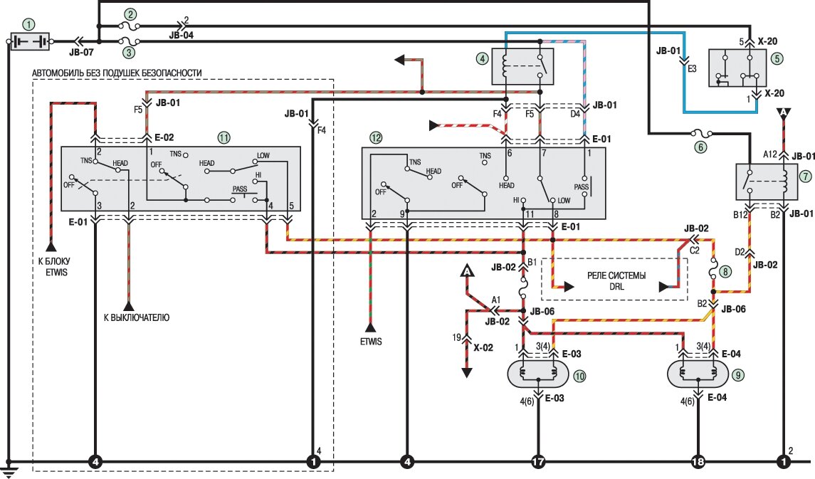 1 – аккумуляторная батарея; 2 – плавкая вставка IG2 (30 А); 3 – плавкая вставка HEAD (25 А); 4 – реле 1 фар головного света; 5 – выключатель (замок) зажигания; 6 – предохранитель HEAD 2 (15 А); 7 – реле 2 фар головного света; 8 – предохранитель HEAD LOW (15 А); 9 – правая фара; 10 – левая фара; 11 – переключатель света фар и указателей поворота; 12 – выключатель задних противотуманных фар