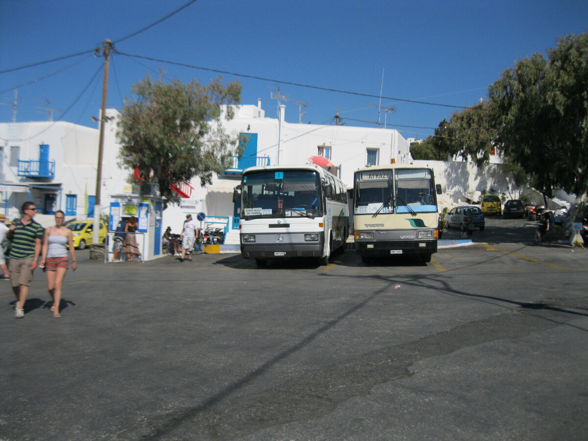 По возвращению в Хору Миконоса с поездки на Делос застал дневной туристический бедлам и с трудом пробрался в центр поселка, т.к. узкие улочки были заполнены толпами круизников. Зашел сначала в супермаркет купил немного продуктов, потом купил в местном фастфуде обед на вынос и отправился в мои апартаменты, обедать и отдохнуть. Далее я направился выполнять вторую часть программы этого дня, так сказать пляжную. С остановки «Fabrika» вот на таком автобусе поехал на южные пляжи. Билеты покупал в будочке, где можно посмотреть расписание. Движение достаточно интенсивное. Я решил начать с фешенебельного пляжа Platys Gialos, который специализируется на семейном отдыхе. Здесь расположено много приличных гостиниц, вилл. Пляж хороший, с крупным светлым песком, ровным входом в море. Я устроился на песочке в бесплатной части пляжа, цены на жезлонги и зонтики даже не узнавал. Людей на пляже не так много, играла негромкая приятная музыка. Водичка местами была красивая. В общем, нормальный кл
