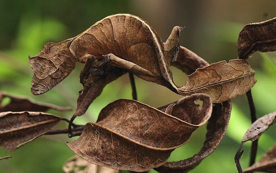 Необычных насекомых можно встретить повсюду. Интересной особенностью некоторых является их умение становиться невидимыми и это можно назвать одной из самых уникальных защитных функций животных. Листохвостый Геккон Обитают эти весьма необычные животные в лесах Мадагаскара и на прилегающих к нему островах. В процессе эволюции у листохвостых гекконов развилась практически безупречная способность к мимикрии, которая позволяет им маскироваться под окружающую среду и выживать в тропических лесах Мадагаскара. Зачастую особи этого вида встречаются в расцветках от зеленого до коричневого цвета, что позволяет им идеально скрываться среди листвы деревьев, поскольку некоторые листохвостые действительно выглядят как опавшие сухие листья. Также за счёт своего цвета листохвостый геккон идеально маскируются на древесной коре или поверхности мха и это не только помогает им прятаться от хищников, но и значительно облегчает добычу пропитания. Мелкие насекомые нередко садятся на замаскированных листох