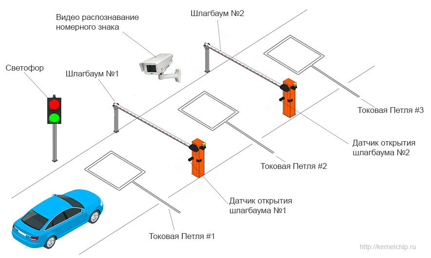 Машина находится между двух закрытых шлагбаумов. В этот момент происходит установление статусов: машина перед шлагбаумом №2 = петля дает сигнал, шлагбаум №1 закрыт. Если всё так, то идёт команда на открытие шлагбаума №2.