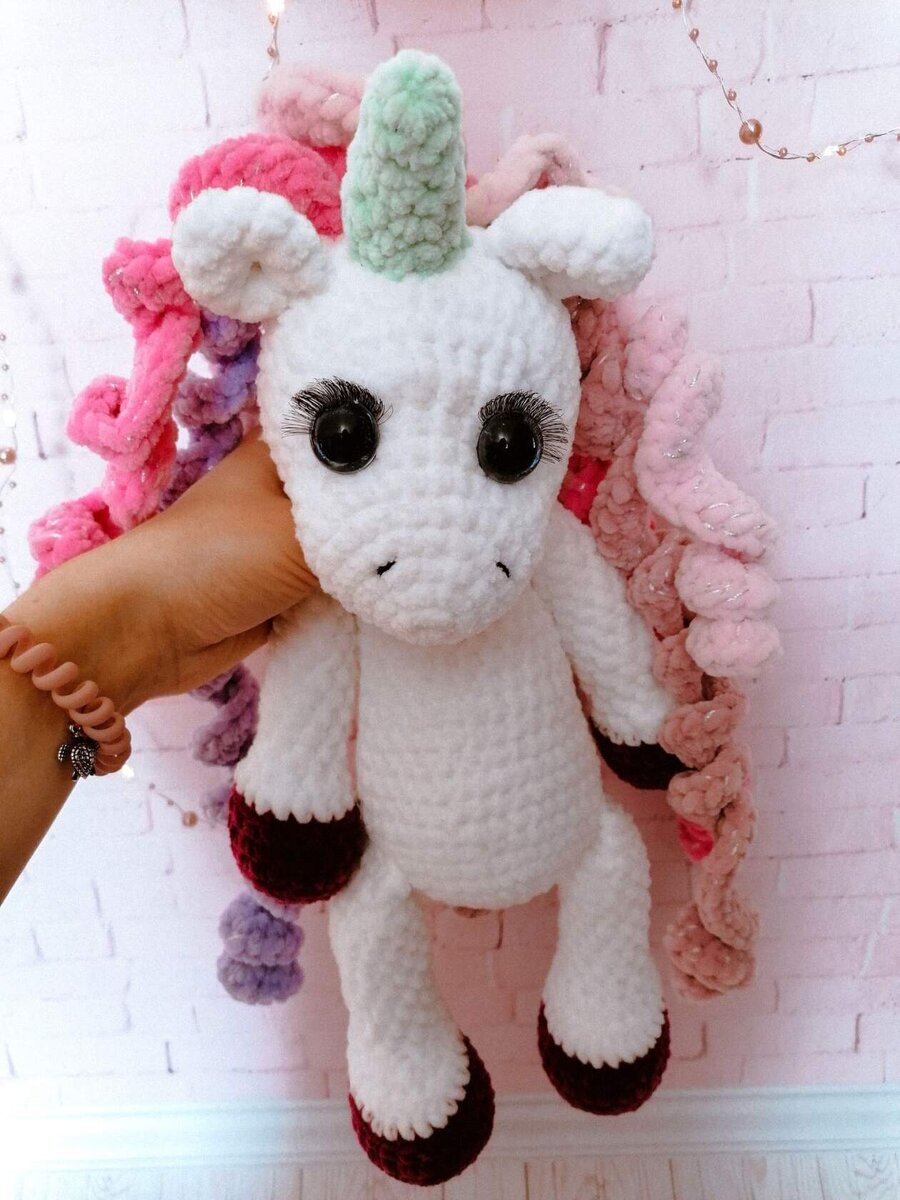 Условные обозначения: сбн - столбик без накида вп - воздушная петля пр - прибавка уб - убавка (...)х6 - повторить действие в скобках 6 раз. Передние ноги 2 штуки (допoлнительный цвет) 1 ряд: 6 сбн. в ка. (6) 2 ряд: 6 приб. (12) 3 ряд: (1 сбн., приб.)*6 (18) 4 ряд: 18 сбн. за заднию стенку 5-6 ряд: 18 сбн. (2 ряда) (18) меняем цвет на основной 7 ряд: 18 сбн. за заднию стенку (18) 8 ряд: (1 сбн., убв.)*6 (18) 9 ряд: убв., 4 сбн., убв., 4 сбн. (10) 10-22 ряд: 10 сбн. (13 рядов) (10) Заканчиваем вязание, нить закрепляем и прячем. Копытце набиваем плотно, дальше не так плотно и только до половины. Задние ноги 2 штуки (допoлнительный цвет) 1 ряд: 6 сбн. в ка. (6) 2 ряд: 6 приб. (12) 3 ряд: (1 сбн., приб.)*6 (18) 4 ряд: (2 сбн., приб.)*6 (24) 5 ряд: 24 сбн. за заднию стенку (24) 6-7 ряд: 24 сбн. (2 ряда) (24) меняем цвет на основной 8 ряд: 24 сбн. за заднию стенку (24) 9 ряд: 8 сбн., 4 убв., 8 сбн. (20) 10 ряд: 6 сбн.