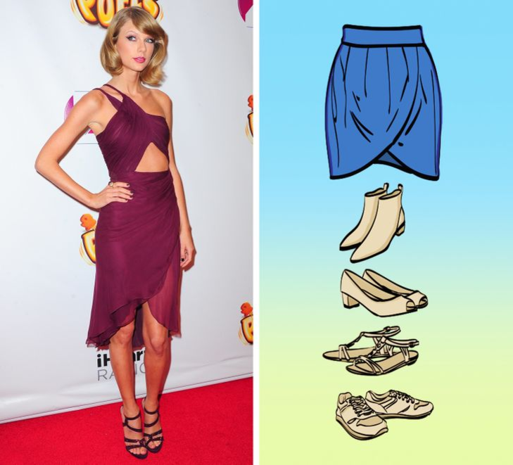 Правильно подобрать повседневный наряд и тем более создать праздничный образ достаточно сложно. Особенно много вопросов возникает при выборе подходящей обуви к к конкретной одежде. Отметим, что если требуется подбирать под юбку обувь, то здесь предлагается огромное количество вариантов, но в зависимости от вида одежды будут уместными разные варианты туфель, сапог. Ошибиться здесь очень сложно, поэтому предлагаем несколько практичных советов, которые помогут правильно подобрать обувь под наряд. 1. Юбка «тюльпан». Вне зависимости от ее длины отлично будут смотреться модели с открытым носком. Для прохладной погоды можно подобрать ботильоны. Выбирать рекомендуется модели нейтрального цвета, обувь не должна притягивать к себе внимание. Такая юбка будет даже смотреться в сочетании с кроссовками, но это если вы планируется просто отправиться на прогулку по парку. Для деловых встреч или культурных мероприятий лучше выбрать туфли с длинным носком на каблуке средней длины. 2. Расклешенная юбка.
