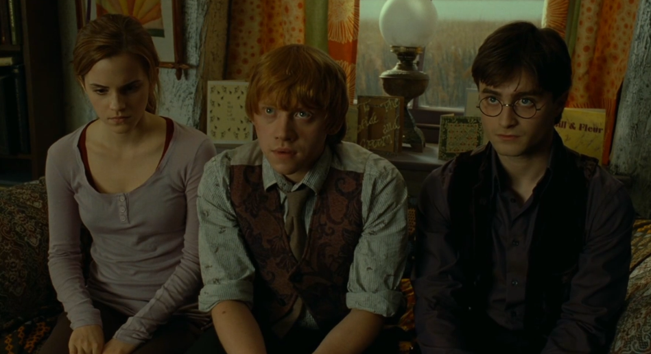 Гарри, в свою очередь, поддерживал и успокаивал девушку, когда Рон начал крутить с Лавандой. А во время поиска крестражей, когда Гермиона не ушла с Роном, а выбрала и дальше помогать Гарри, он утешал девушку, обнимая её, танцуя с ней, и отвлекая от мрачных мыслей.