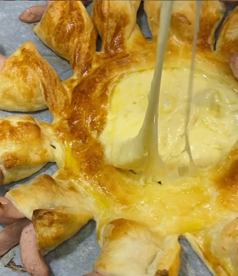 Надо раскатать оба пласта слоеного теста и вырезать круг(из обрезков я приготовила сосиски в тесте).