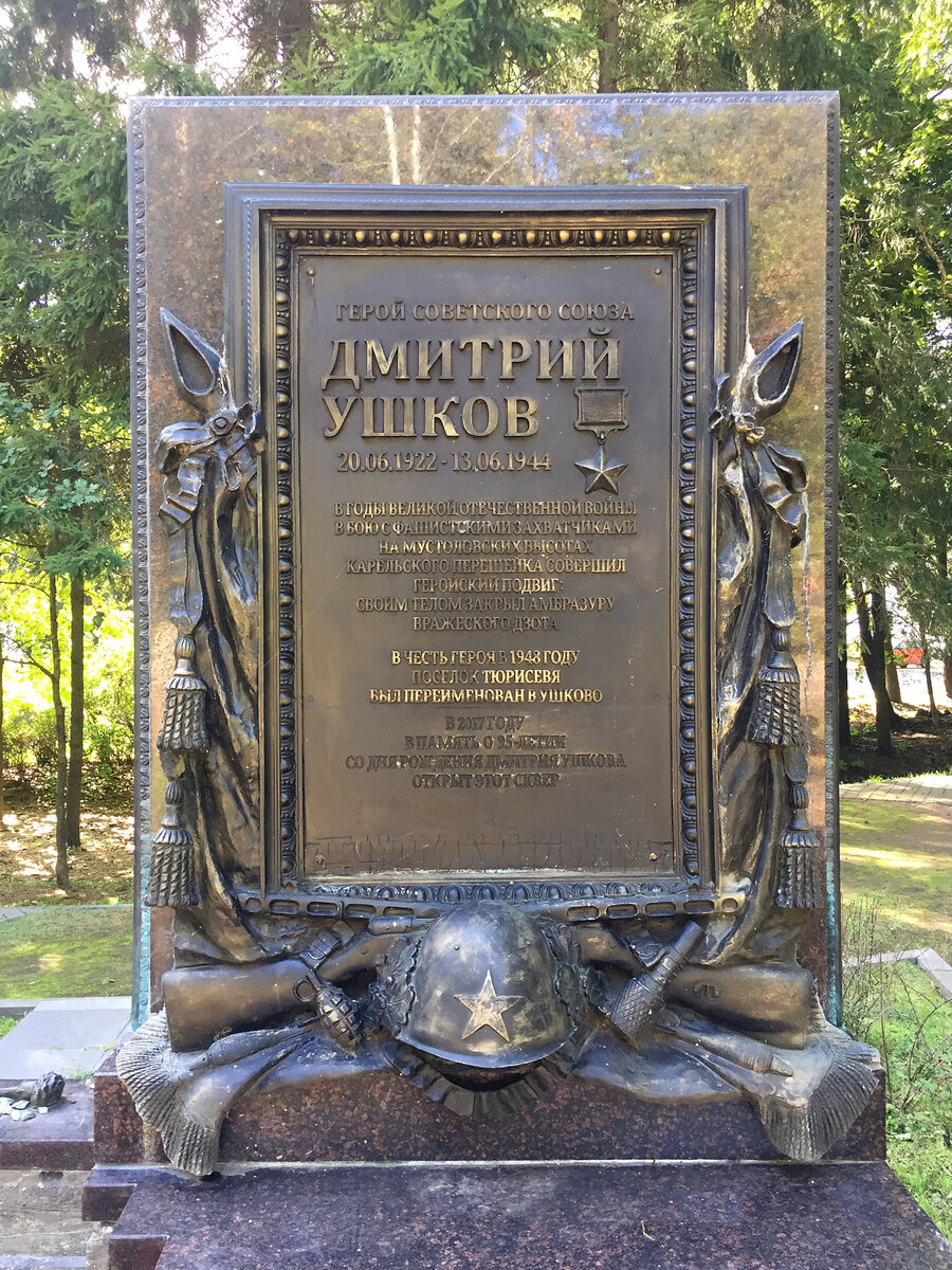 9 мая 2017 года благодаря скульпторам архитектурной мастерской "Пантеон" в Ушково появился большой воинский мемориал, посвящённый Великой Отечественной войне. В частности здесь отданы почести Герою Советского Союза Ушкову Дмитрию Константиновичу, который совершил акт самопожертвования, закрыв своим телом амбразуру вражеского ДЗОТа. Батальон наступал на высоту, превращенную врагом в крепкий опорный узел. Из замаскированного ДЗОТа ударил пулемет. Дмитрий Ушков шел в атаку впереди роты Чтобы попасть в него гранатой, нужно было подобраться еще ближе. Граната разорвалась у самой амбразуры. Пулемет захлебнулся, но ненадолго. А гранат у Дмитрия больше не было. Тогда он поднялся, быстро побежал вперед. Всего несколько мгновений продолжался этот стремительный рывок, завершившийся сильным прыжком к амбразуре дзота. Пулемет замолчал. Вторая рота овладела опорным пунктом. Потеряв выгодную позицию на Мустоловских высотах, враг начал отходить. Звание Героя Советского Союза присвоено посмертно Ука