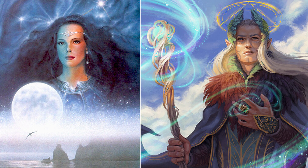 Обратимся же к женским ликам загадочного легендариума. Варда Элентари, именуемая также Элберет – «высочайшая», царица небесная, «создающая звезды», несущая свет, дарованный Создателем. И, конечно, возлюбленная супруга... В памяти невольно возникает строка из сказки Пушкина: «Месяц под косой блестит, а во лбу звезда горит». Да, царевна-лебедь. Или жизнь дающая, несущая цветочек «ярый». Перворожденная богиня, имеющая множество имен и ликов. Дона и Селена, Лада и рядом Макошь, позднее Живена... «Магиня». И имя ей - магия.