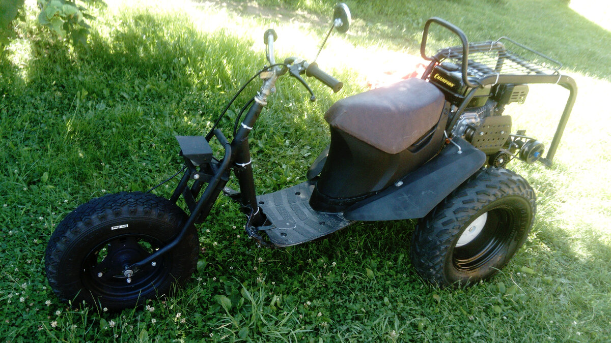 Вторая доработанная версия. Сзади мы вместо тяжелых дубовых цельнолитых колес из резины. Решили поставить сельхоз резину 5/10. Ход стал намного мягче. Спереди также поставили резину 5/10. Спереди диск делали из диска прицепа Пчелка, так как мы хотели спереди оставить барабанный тормоз от скутера, вилку тоже сделали из рукоятей для управления мотоблоком. Получилось отлично. Также с зади над ДВС сделали каркас безопасности он же багажник. На него также может сесть второй человек. Мы с папой ездили в вдвоем, каркас его вес 120 кг выдерживает спокойно.