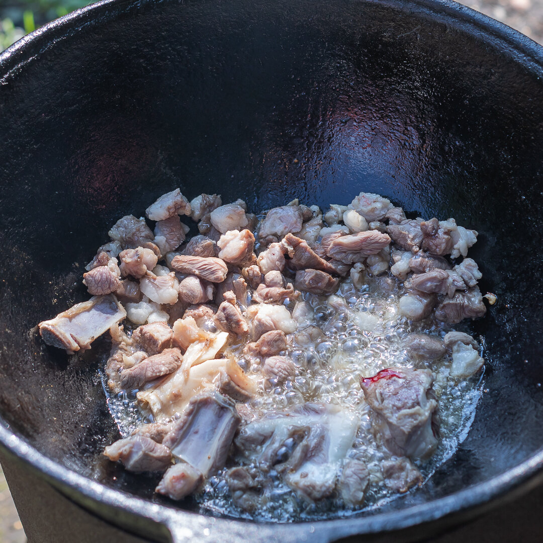 Масло растительное – 250 гр. Разогреваем казан, прогреваем масло и обжариваем мелко нарезанную баранину. Закладываем лук с пригоршней моркови, продолжаем обжарку. Добавляем всю морковь.