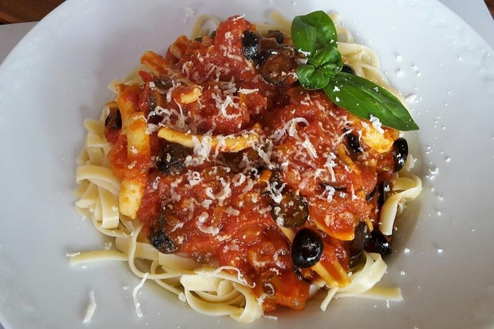 О, кальмары! Удивительного вкуса гады. Морские, в смысле, гады. Ну, или дары моря… Как кому больше нравится. Очень люблю кальмары, и есть, и готовить. Одна проблема — их надо готовить или очень быстро, или очень долго — потому что елок в кальмарах коагулирует очень быстро, становится твердым, а потом поди дождись, когда он вновь размягчится… Поэтому кальмары в остром томатном соусе по итальянски имеют один секрет — самих кальмаров надо отправлять туда в самом конце. А если вы положите их в середине, как иногда советуют, то вам придется оставить их тушится часа на полтора, как минимум, что долго и убивает вкус. Берем: Как готовим: Кальмаров моем, чистим. Если хотите — немного отбиваем их, надев на скалку и накрыв пленкой. Режем на кольца. Нарезаем оливки колечками, помидоры — кубиками, лук — мелкими кубиками, а чеснок рубим. На сковородке разогреваем немного масла, обжариваем в нем лук и добавляем пару ложек томатной пасты. Жарим еще пару минут, засыпаем чеснок. Еще через ми