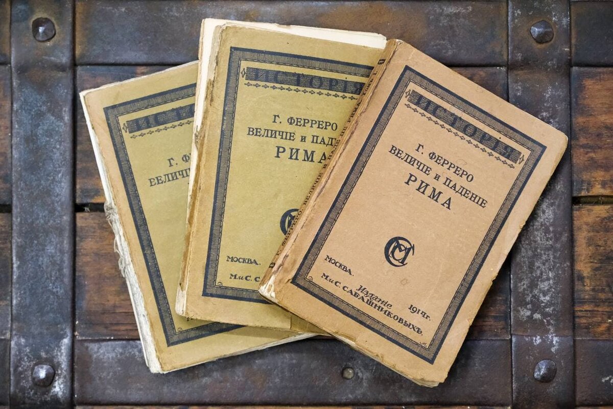 «Величие и падение Рима», Ферреро Гульельмо, Москва, 1914 год. В своей работе мы не ограничиваемся только реставрацией. Напротив, часто мы сталкиваемся с интересными заказами. И на этот раз нам предстояло создать переплет, который бы соответствовал содержанию трех томов книг. Все-таки, согласитесь, величие Рима немного блекнет на протертом коричневом фоне? Это была увлекательная работа над собственным дизайном. В результате мы получили красочный составной переплет из двух видов кожи с богатым тиснением. Это тот случай, когда дизайн переплета в полной мере отражает содержание книг. Как известно, историю Римской империи тщательно документировали не один десяток современников тех событий. Все наши школьные или университетские учебники по всеобщей истории так или иначе опираются на записи Плиния, Плутарха, Тацита или Светония. Казалось бы, если уже есть наиболее точные и достоверные сведения, зачем писать книги о величии и падении Рима в начале XX века? Все дело в том, что интерес к истори