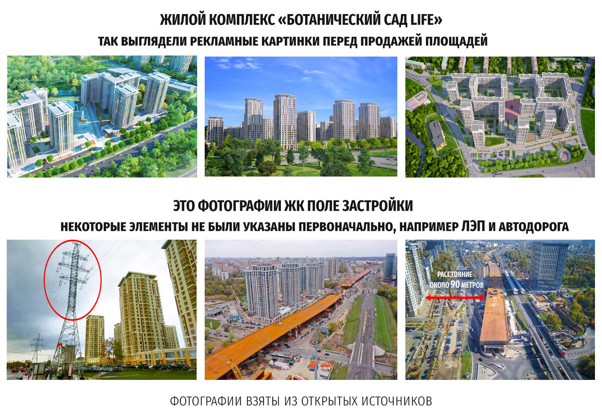 1. Смотрят исключительно как выглядят квартиры и сами дома, какой вид из окна, часто делают вывод по фото. Не знакомятся с планами застройки территории и с планами городского строительства. Вот пример, когда вид на рекламных рендерах ЖК сильно отличается от фактической картины сегодняшних дней.