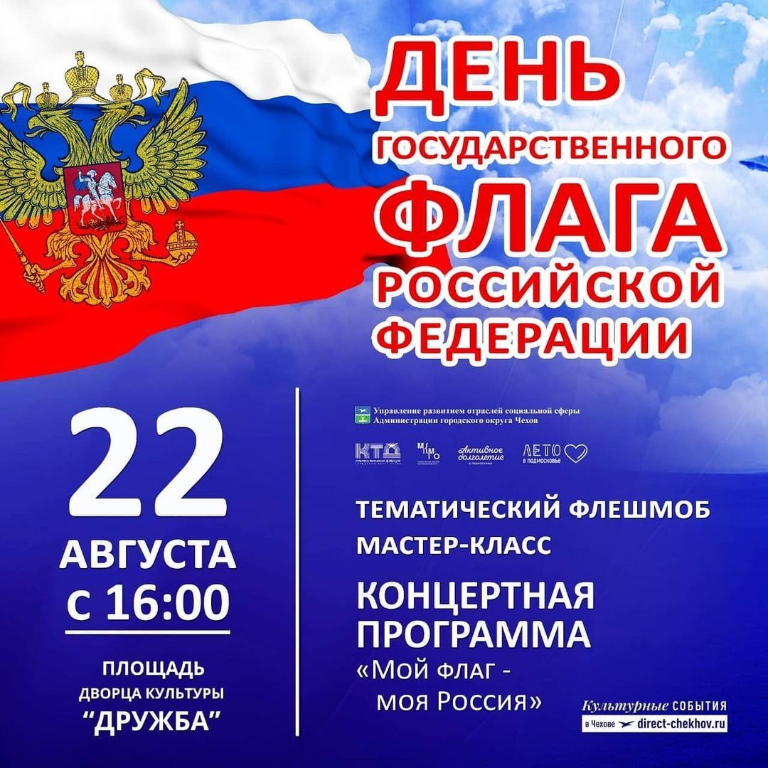 В воскресенье на площади у ДК «Дружба» отметят День Государственного флага Российской федерации. Концертную программу, в которой примут участие солисты и творческие коллективы округа, предварит тематический флешмоб. Также на площади пройдут различные мастер-классы. Мероприятие, которое начнется в 16:00, обещает стать ярким и зрелищным.