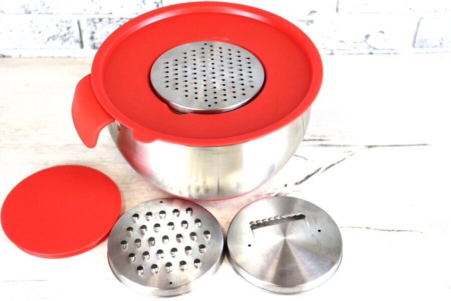 Чаша с терками. С помощью чаши вы с легкостью нашинкуете продукты, сможете использовать чашу, как емкость для блендера или миксера, как контейнер для хранения готовой пищи. Антискользящий материал на дне чаши, мерная шкала и носик для слива - обеспечит дополнительный комфорт во время готовки. ПРЕИМУЩЕСТВА. ХАРАКТЕРИСТИКИ. КОМПЛЕКТАЦИЯ. Чаша с 3 терками-насадками - удобство в приготовлении пищи!