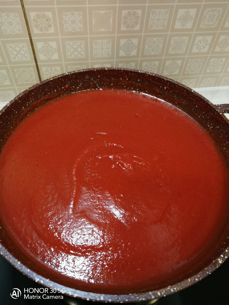 Приготовим вкусный кетчуп на зиму Нам понадобится: 4 кг красных помидор 0,5 кг болгарского перца По 2 головки чеснока и лука 3 шт гвоздички 3 лавровых листа 15-20 горошин чёрного перца 5 ст л сахара 2 ст л соли 50 мл 9% уксус Овощи вымыть, очистить и порезать. Поставить на огонь и варить 50 минут. Через ситечко убираем сок, 3 стакана. Добавляем специи, соль, сахар и провариваем ещё минут 20. Выключаем и остужаем не много. Вынимаем лавровый лист и измельчаем блендером. Далее, протираем через ситечко, а жмых убираем. Получается вот такой соус: Ставим на огонь и доводим до кипения. Добавляем уксус и выключаем. Сахар можете регулировать по вкусу. Переливаем в баночки, закатываем. У меня вышло 5 баночек по 0,5 литра. Приятного аппетита!